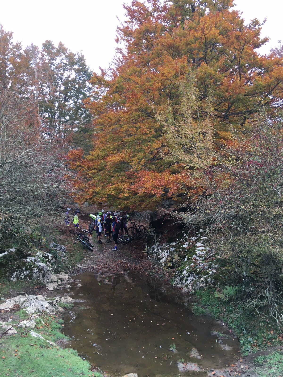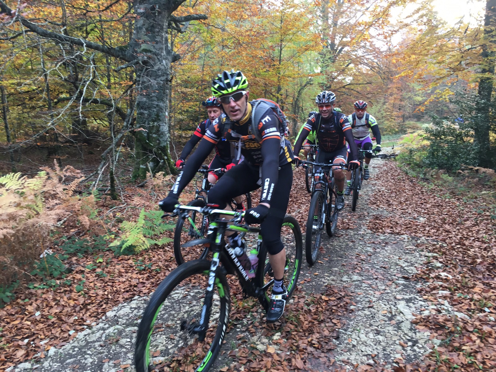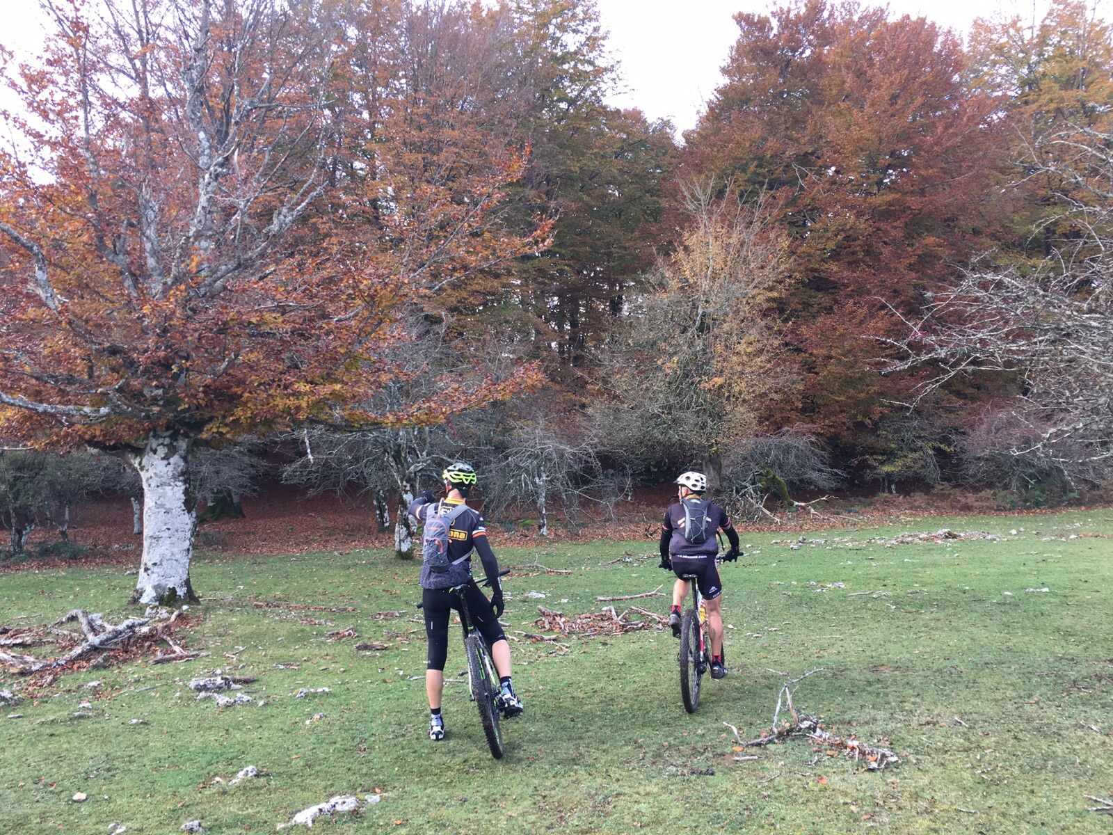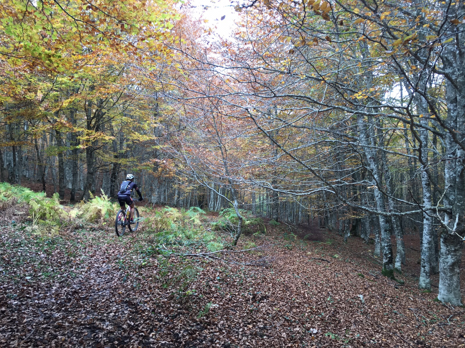 Muchos nos preguntaban por el track y siempre les decíamos que no teníamos nada, que estaba en nuestro cerebro. ¡105 kms por Urbasa sin track!, nos decían. ¡Nos perderemos!. Mi buen amigo Nicolás y yo nos hemos perdido muchas veces pero conocemos a todos los arboles de Urbasa. Al finalizar la ruta alguno me decía atónito: «no se como puedes acordarte de todo el camino sin perderte!. Hay mil desvíos y zonas de pura intuición ya que el suelo lleno de hojas borra todos los caminos o sendas y te tienes que guiar por instinto. Al final todo salió bien y salimos bien de todas las zonas de bosque. Si no me cuelgan, jejejeje.