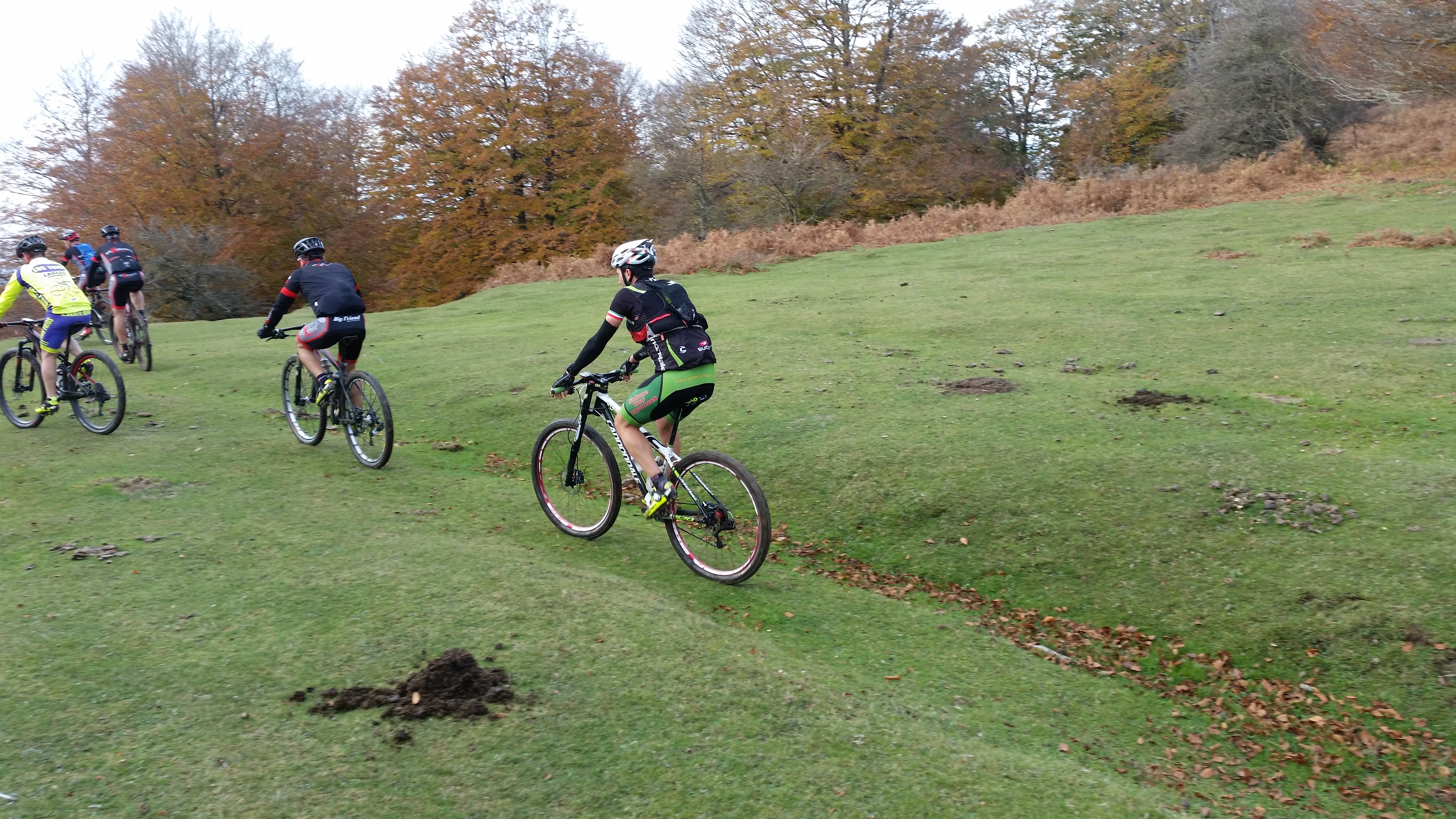 Una vez en el Dulantz, iniciamos el descenso a Zunbeltz, y enseguida tercer problema. Gorka pierde el pasador de uno de los frenos, pero no hay nada que con un buen alambre no se pueda arreglar. Una vez subsanado, bajamos por una zona pedregosa, muy rota pero enseguida nos desviamos a la izquierda para iniciar un descenso sobre un mar de hojas alucinante. Llegamos al puerto de Lizárraga y tras 4 kms de ascensión tenemos el desvío que nos lleva al monte San Donato con una altitud de 1.492 metros.