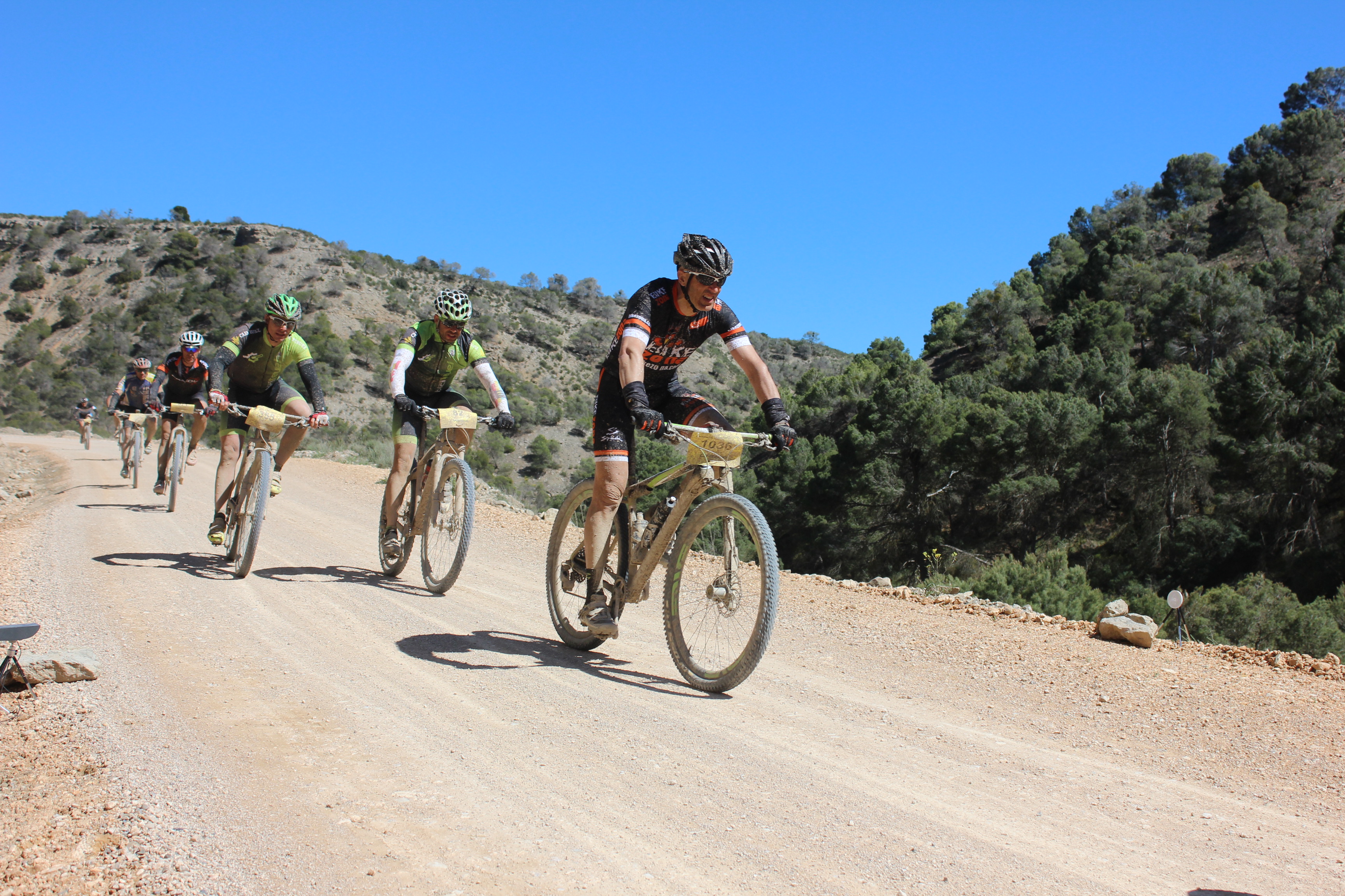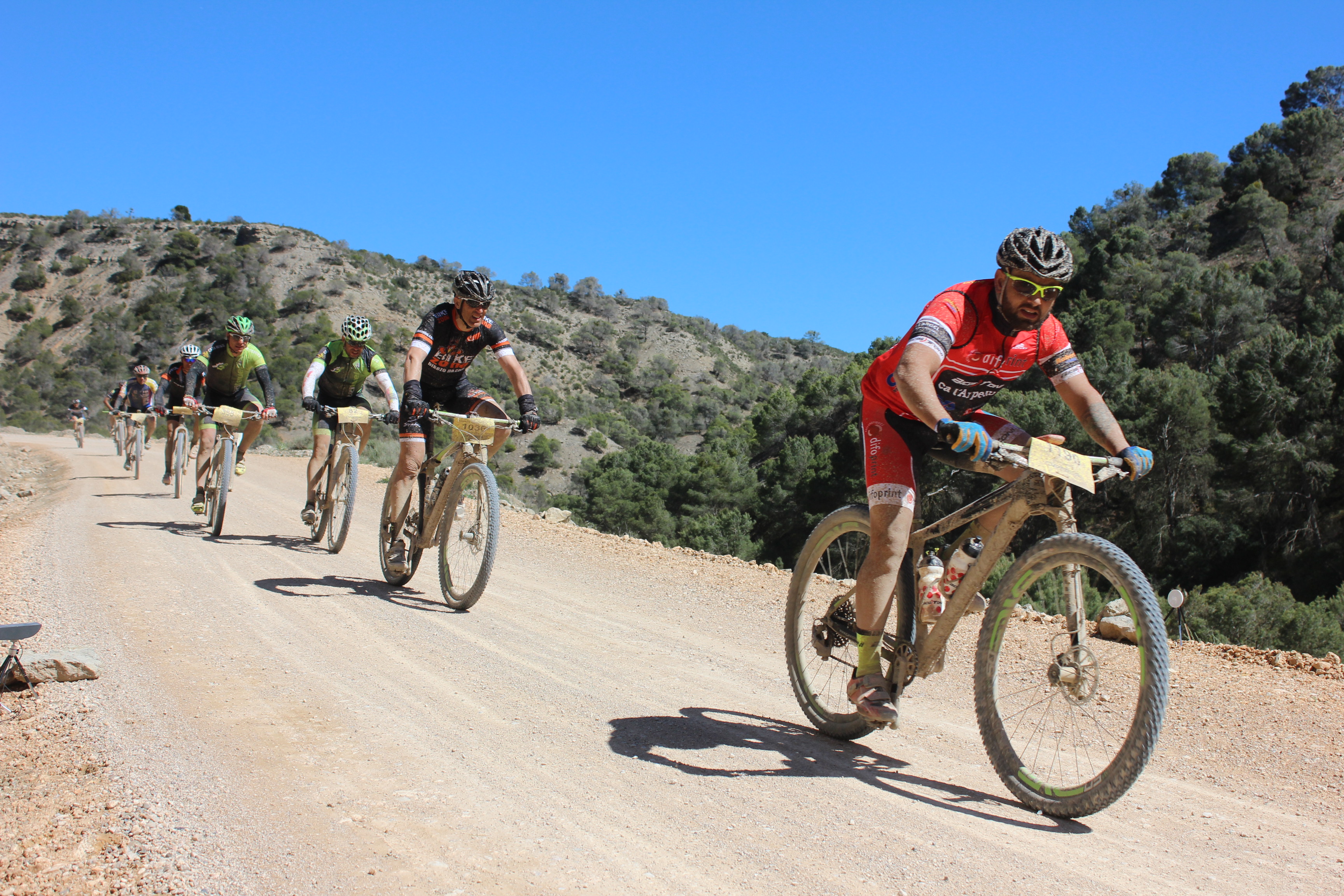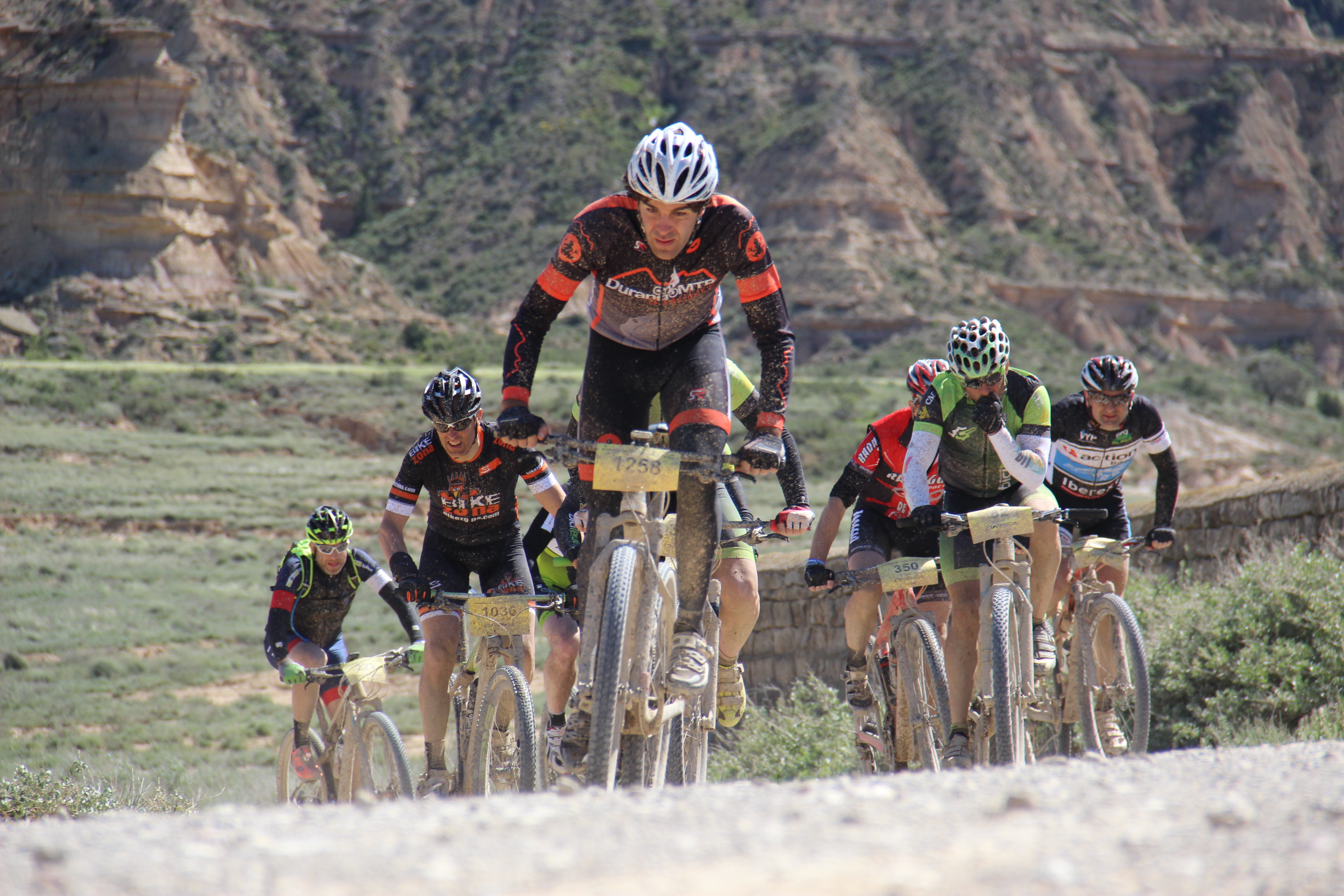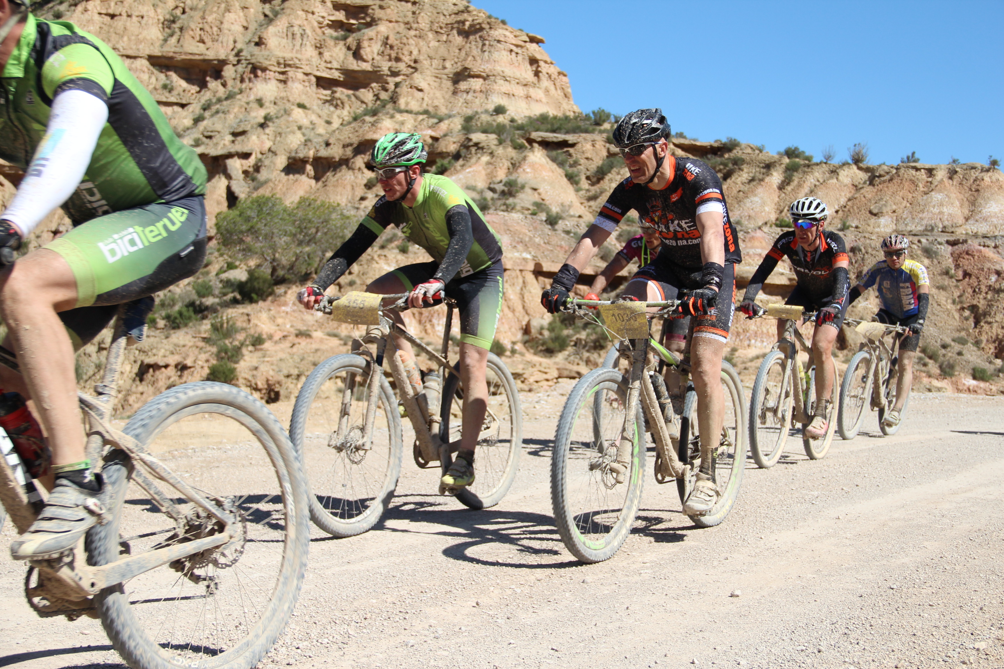 La salida como todas las pruebas es a fuego y esta es una competición donde colocarse bien es muy importante de cara al resultado final. Cruzamos la localidad de Sariñena y enseguida cogimos una pista donde debido a las lluvias torrenciales de los días anteriores se habían formado unos charcos con un barro que se pegaba como el mortero al cuadro de nuestras bicicletas y a los cristales de nuestras gafas. Ya en esta primera parte de la carrera donde en teoría era la zona que tendríamos al viento a favor, vimos que no iba a ser así y que en las zonas favorables nos daba más de costado. Los 1.500 bikers que salimos en el cajón Orbea luchábamos para situarnos de la mejor manera posible, haciendo que la carrera tuviera una tensión importante.