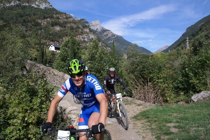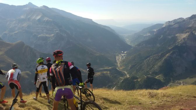 Una vez en Villanúa, y como no se nos permitía hacer la bajada de la Fuente del Paco el sábado, fecha para la que estaba prevista, debido a la celebración del Campeonato de España de Btt Enduro que tendría lugar en la citada localidad ese mismo fin de semana, el grupo tuvo el regalo de esa bajada el mismo viernes. Es verdad, que hacía bastante calor y empezábamos a encontrarnos un poco cansados, pero la bajada merecía la pena y una vez finalizada después de haberla gozado a tope, fuimos a todo correr a Castiello a comer las migas con un hambre voraz.