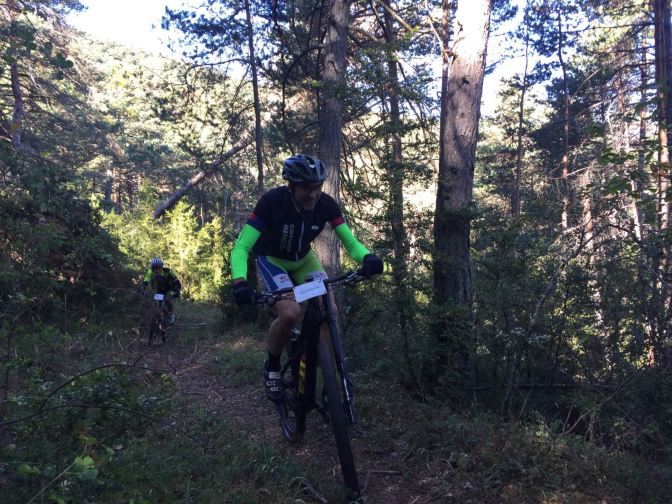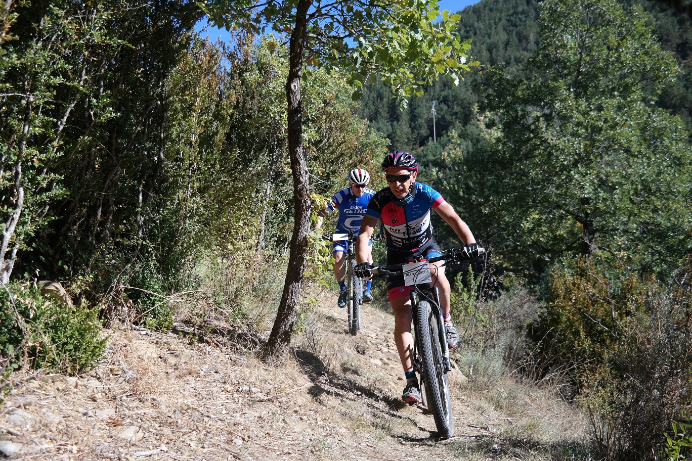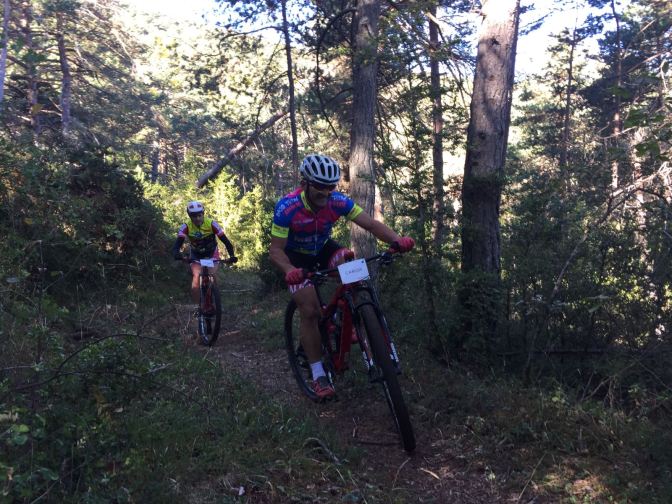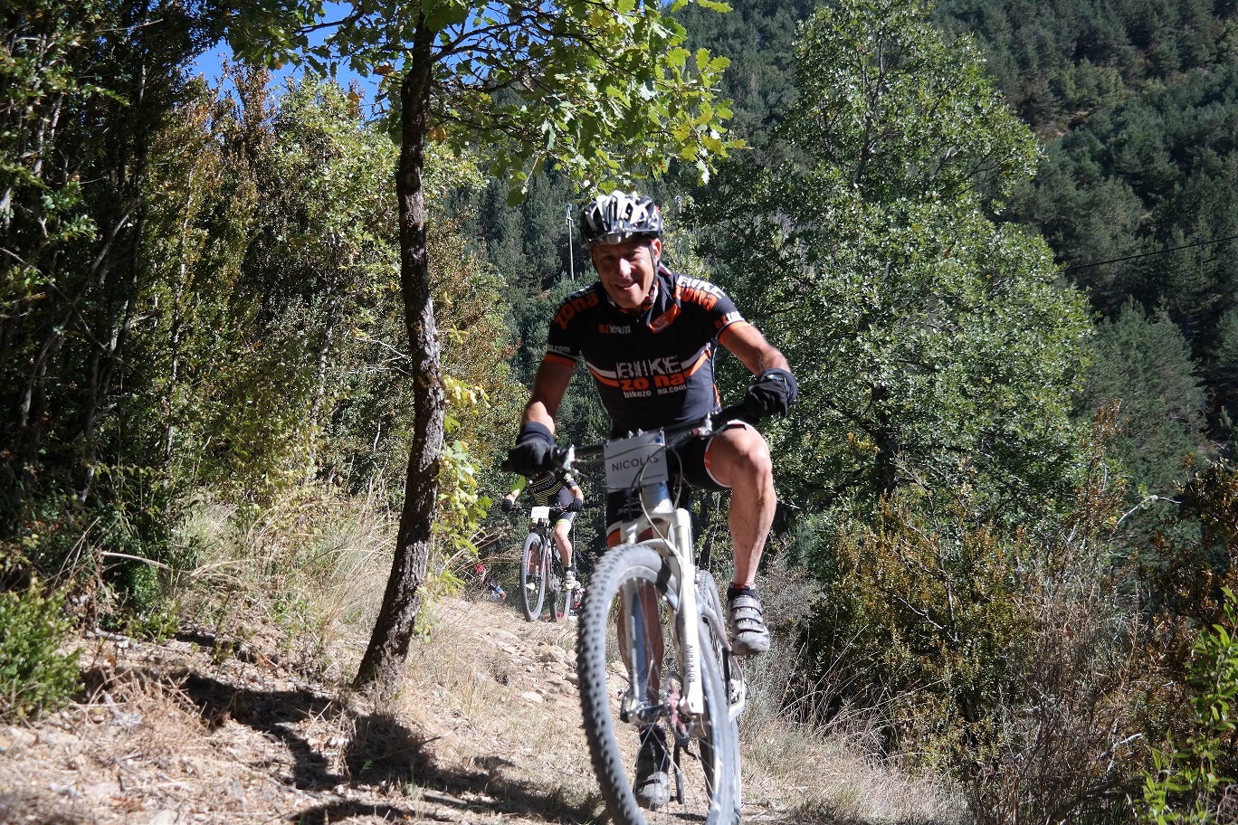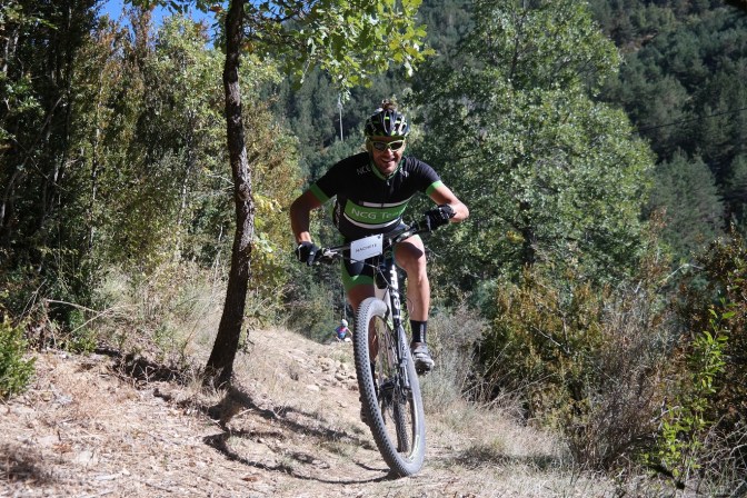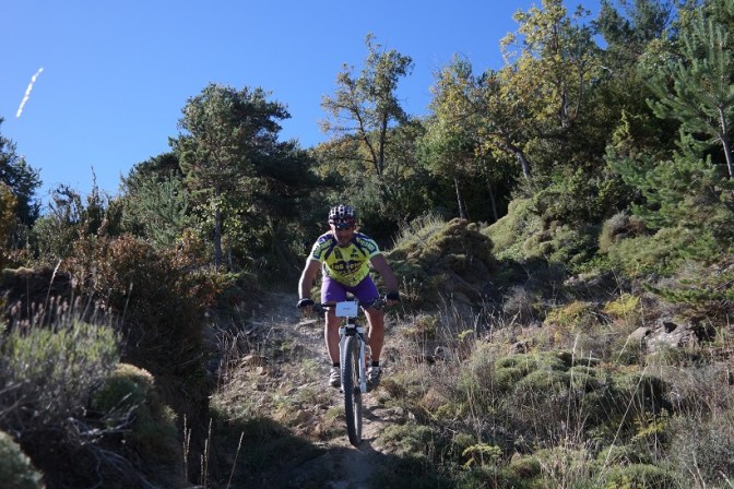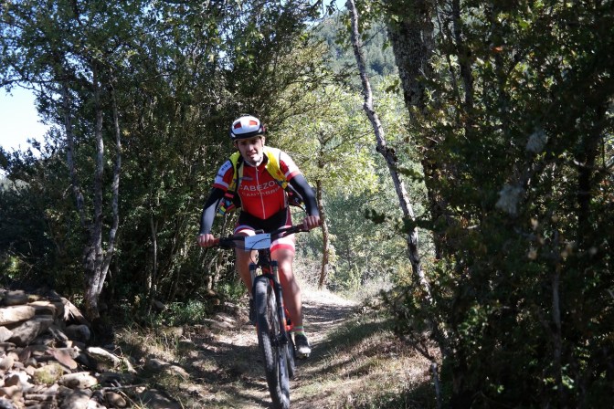 Sin terminar la senda en su totalidad, pero llegando casi al final, enlazamos con la senda Font Ferre en subida. El primer tramo es técnico y en el segundo tuvimos que apretar muy bien los machos y tirar para arriba con mucha fuerza ya que la pendiente era seria. De nuevo enlazamos con la carretera de Oroel y nos dirigimos hacia Navasa, donde tendríamos el avituallamiento de la jornada. El primer tramo era en subida con pasos de cierta dificultad y una vez iniciada la bajada el disfrute fue total, eso sí, superando dos pasos bastante complicados.