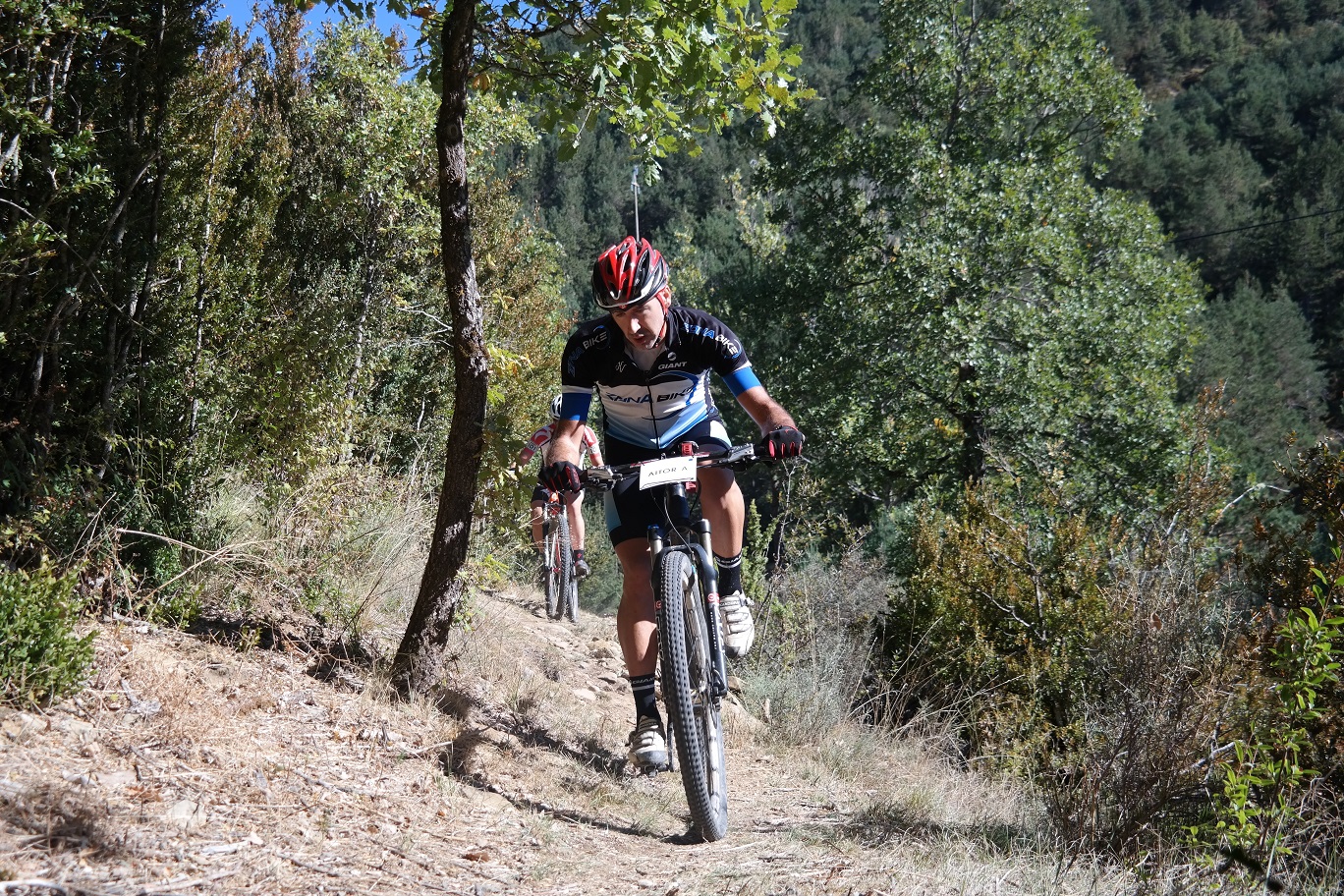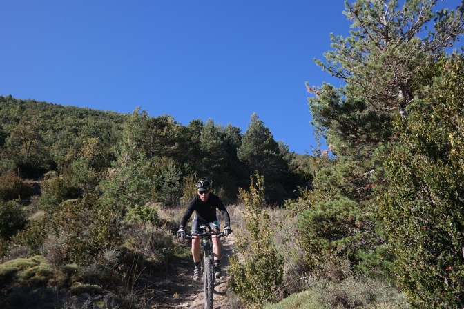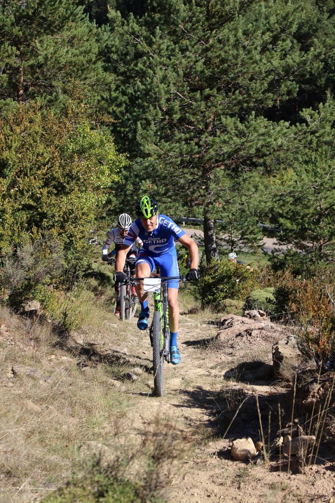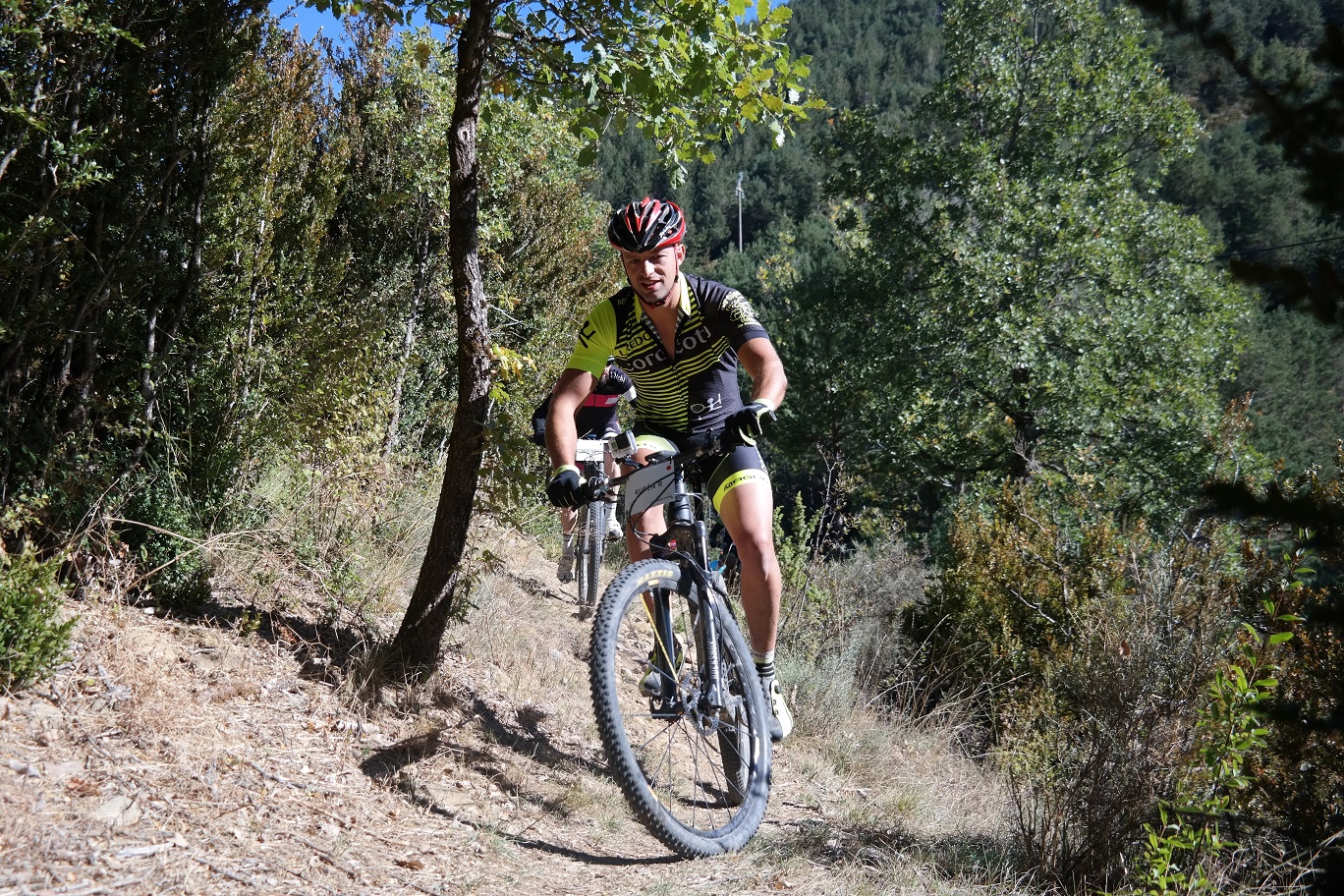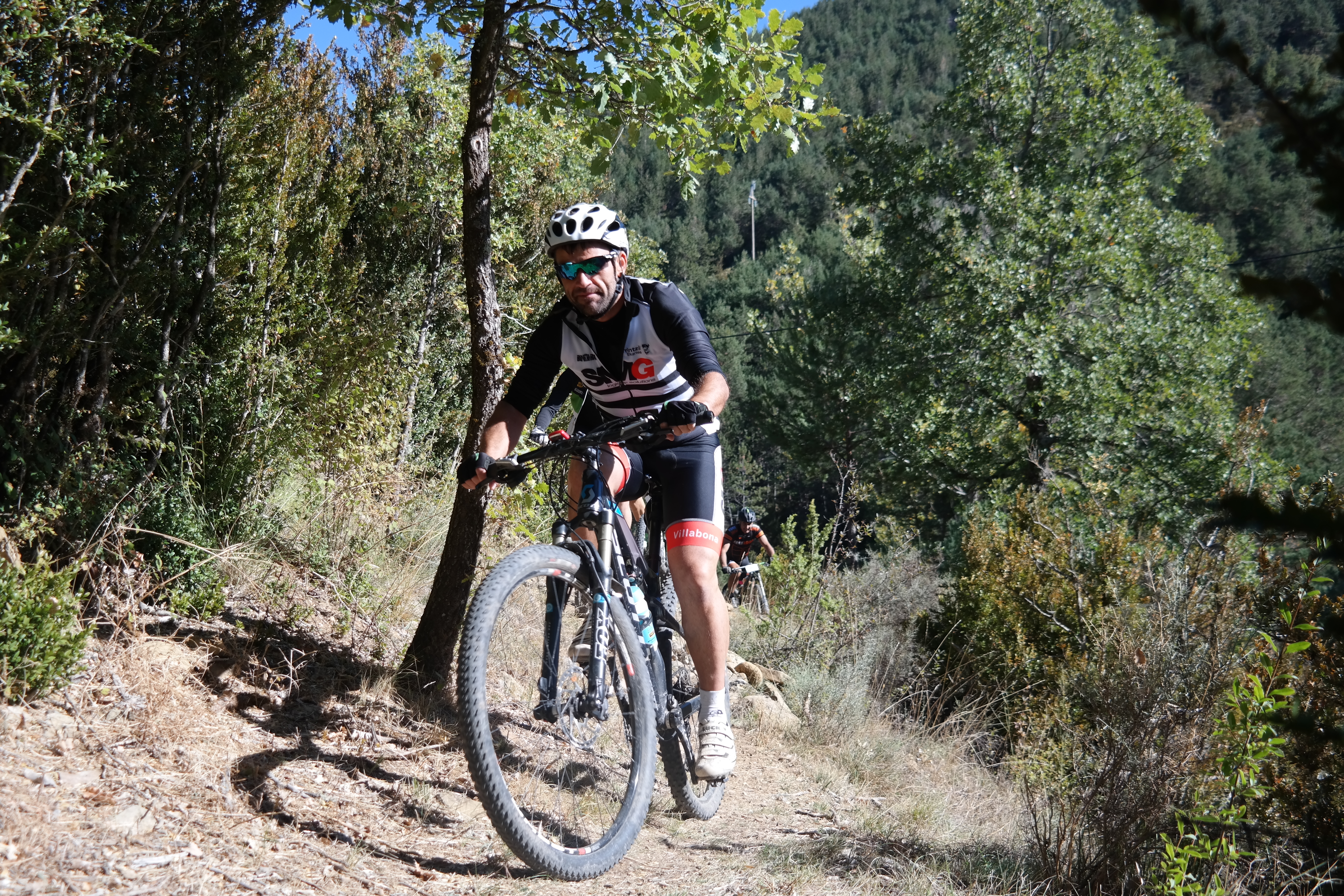 Sin terminar la senda en su totalidad, pero llegando casi al final, enlazamos con la senda Font Ferre en subida. El primer tramo es técnico y en el segundo tuvimos que apretar muy bien los machos y tirar para arriba con mucha fuerza ya que la pendiente era seria. De nuevo enlazamos con la carretera de Oroel y nos dirigimos hacia Navasa, donde tendríamos el avituallamiento de la jornada. El primer tramo era en subida con pasos de cierta dificultad y una vez iniciada la bajada el disfrute fue total, eso sí, superando dos pasos bastante complicados.