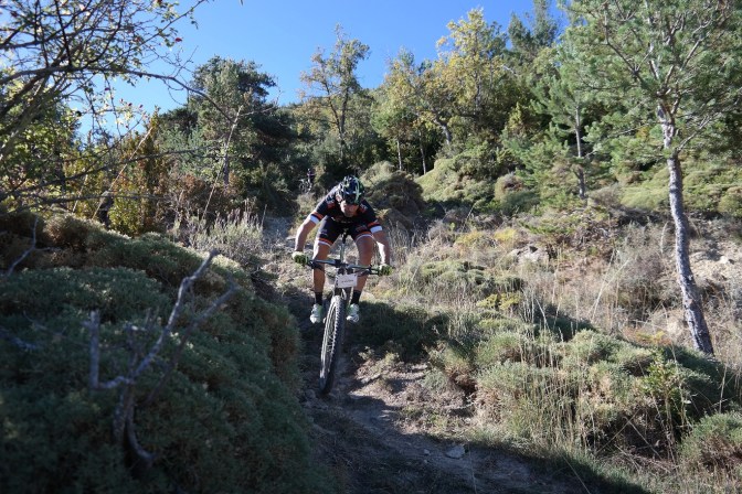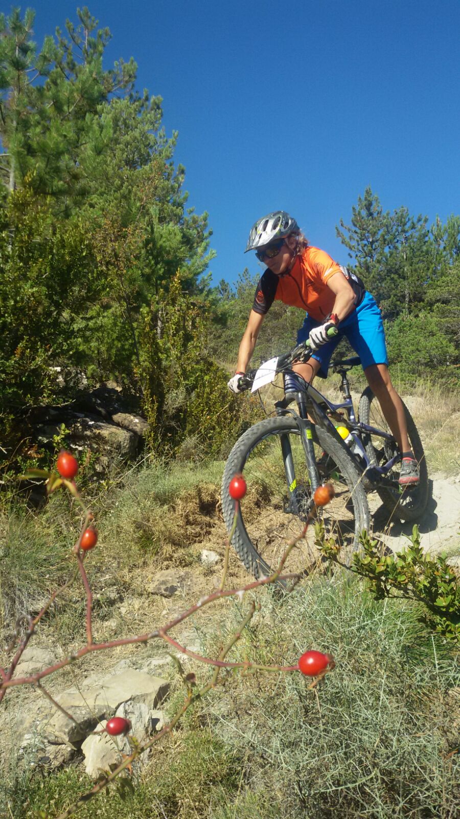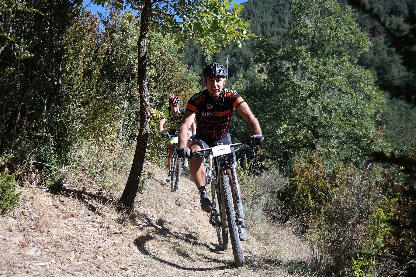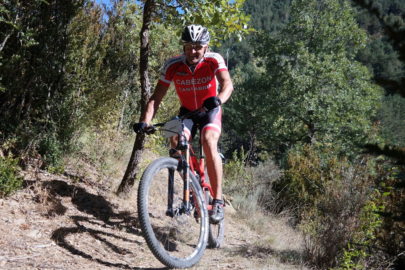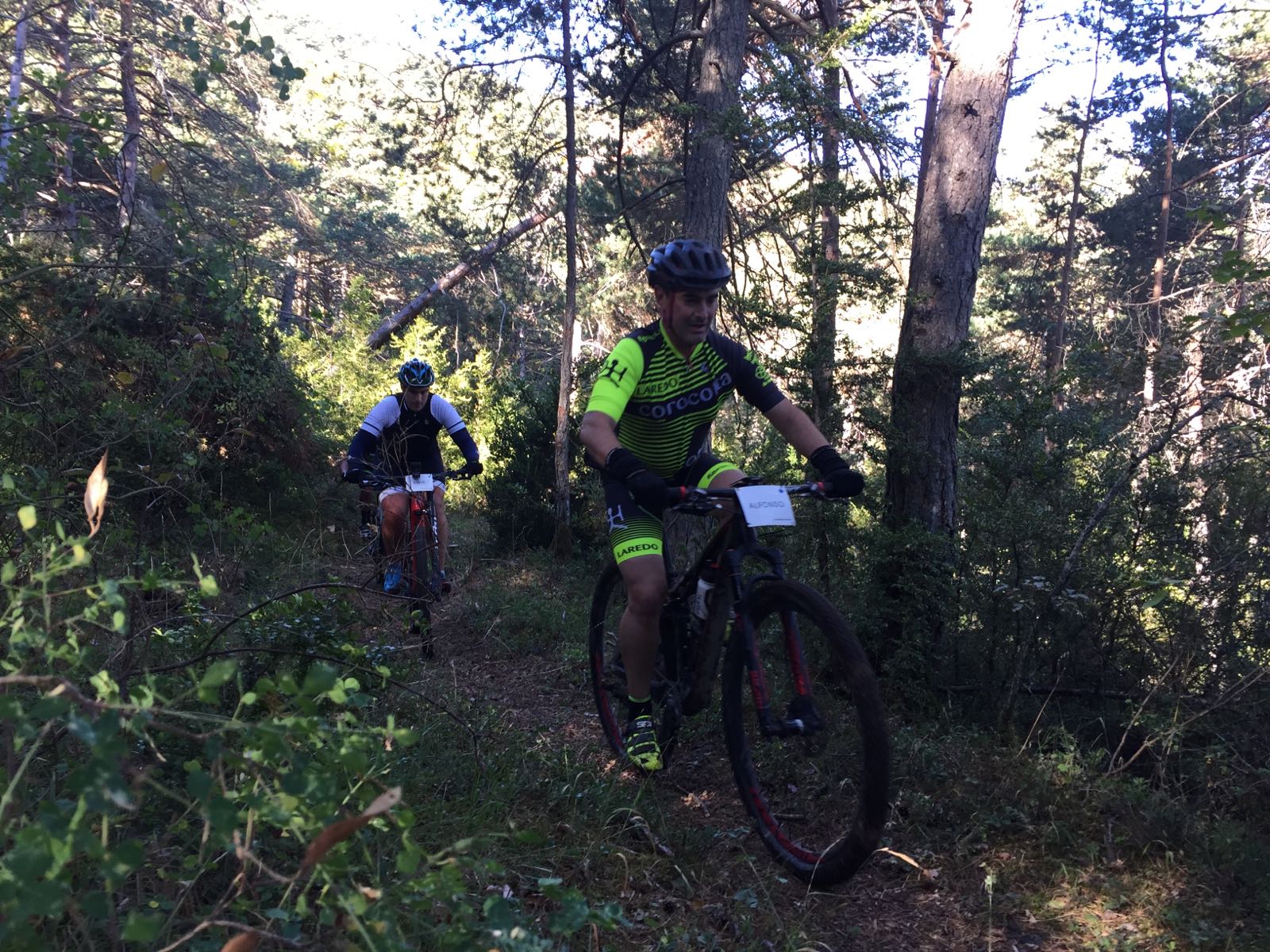 Sin terminar la senda en su totalidad, pero llegando casi al final, enlazamos con la senda Font Ferre en subida. El primer tramo es técnico y en el segundo tuvimos que apretar muy bien los machos y tirar para arriba con mucha fuerza ya que la pendiente era seria. De nuevo enlazamos con la carretera de Oroel y nos dirigimos hacia Navasa, donde tendríamos el avituallamiento de la jornada. El primer tramo era en subida con pasos de cierta dificultad y una vez iniciada la bajada el disfrute fue total, eso sí, superando dos pasos bastante complicados.