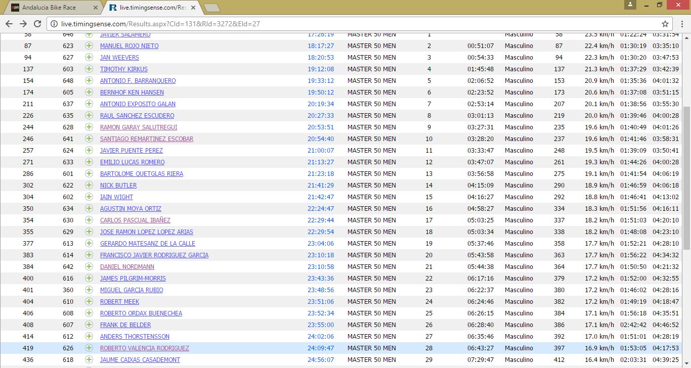 Para mí, como siempre, lo más importante y con lo que me quedo realmente es con la gente que te encuentras por el camino, esos ciclistas que no conocías y que después de sufrir juntos durante horas, te das cuenta que empiezan a formar parte de tu vida, de tu afición por este deporte tan exigente, pero a su vez, tan apasionante. Ha sido un auténtico placer poder compartir con grandes amigos esta vivencia y transmitir este entusiasmo, para que el año que viene seamos muchos más los que vengamos aquí a dejarnos la piel, pero también a disfrutar juntos de una prueba inigualable como es la Andalucía Bike Race. Os animo a que esta prueba figure en vuestra agenda en 2018. Yo como diría un castizo, «las he pasado putas», pero volveré, no lo dudéis.
