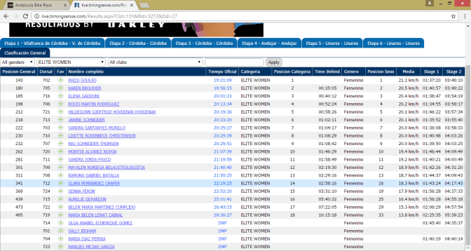 En élite femenina la líder era la brasileña Raiza Goulao, siendo la primera española Rocío Martin Rodríguez.